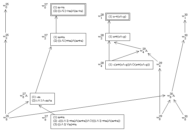 Figs 22-28 must be thought of, we think, as combined in a synoptic tableau like the one given in Fig 30. It is based on the principles formulated in 3.1.4. "A" stands for A-world; all lines linking points w and/or A represent arrows, all pointing upwards.